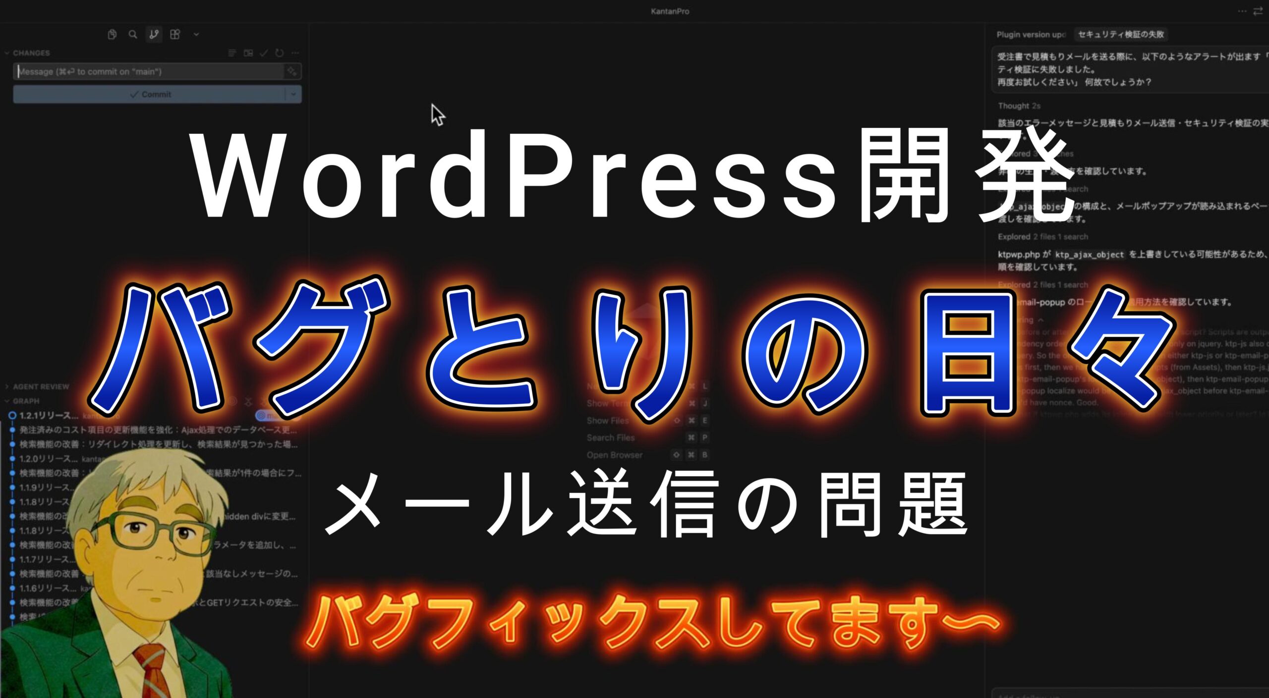 WordPress管理画面で見積書作成やバグ修正を行う実演が紹介されています。AIを活用して効率的に作業を進め、見積もりPDFの送信や進捗ステータスの自動更新など、便利な機能が紹介されています。